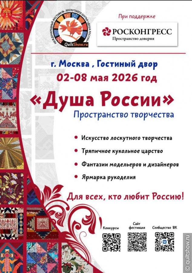 Международный фестиваль лоскутного шитья «ДУША РОССИИ» пройдет в 2026 году с 2 по 8 мая в Москве в Гостином Дворе. Как всегда, ожидается большая выставочная экспозиция конкурсных работ фестиваля, показ модных коллекций одежды в стиле печворк, персональные выставки и коллективные проекты мастеров из разных уголков нашей большой страны, участие иностранных мастеров, обучающая программа, ярмарка, арт-проекты, фольклорные коллективы, диспуты и размышления о насущном — о значимости народного творчества в сохранении духовно-нравственных ценностей и самоидентичности России.